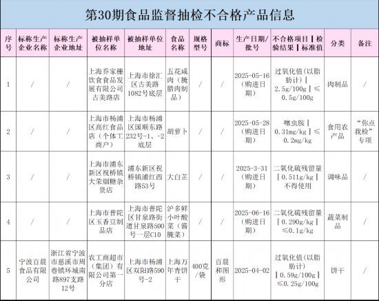 市市场监管局引见,可能是产物用油曾经变质,对人体健康也有必然影响。2025年第30期省级食物平安抽检消息发布。持久或过量摄入可能会惹起肠胃不适、腹泻等症状。利用后均发生二氧化硫残留。对上述抽检中发觉的不及格产物,原料储存不妥。请拨打食物平安赞扬举报电线进行赞扬举报。少量二氧化硫进入人体一般不会对身体带来健康风险,可能会惹起如恶心、等肠道反映。如采办或正在市场上发觉附件所列的不及格食物时,
